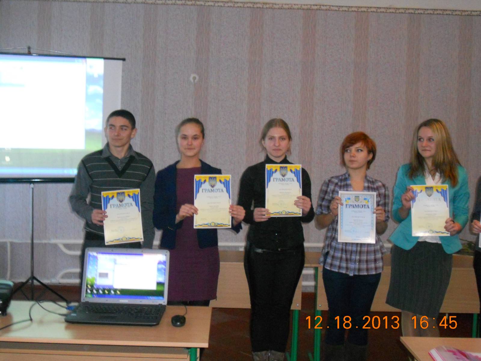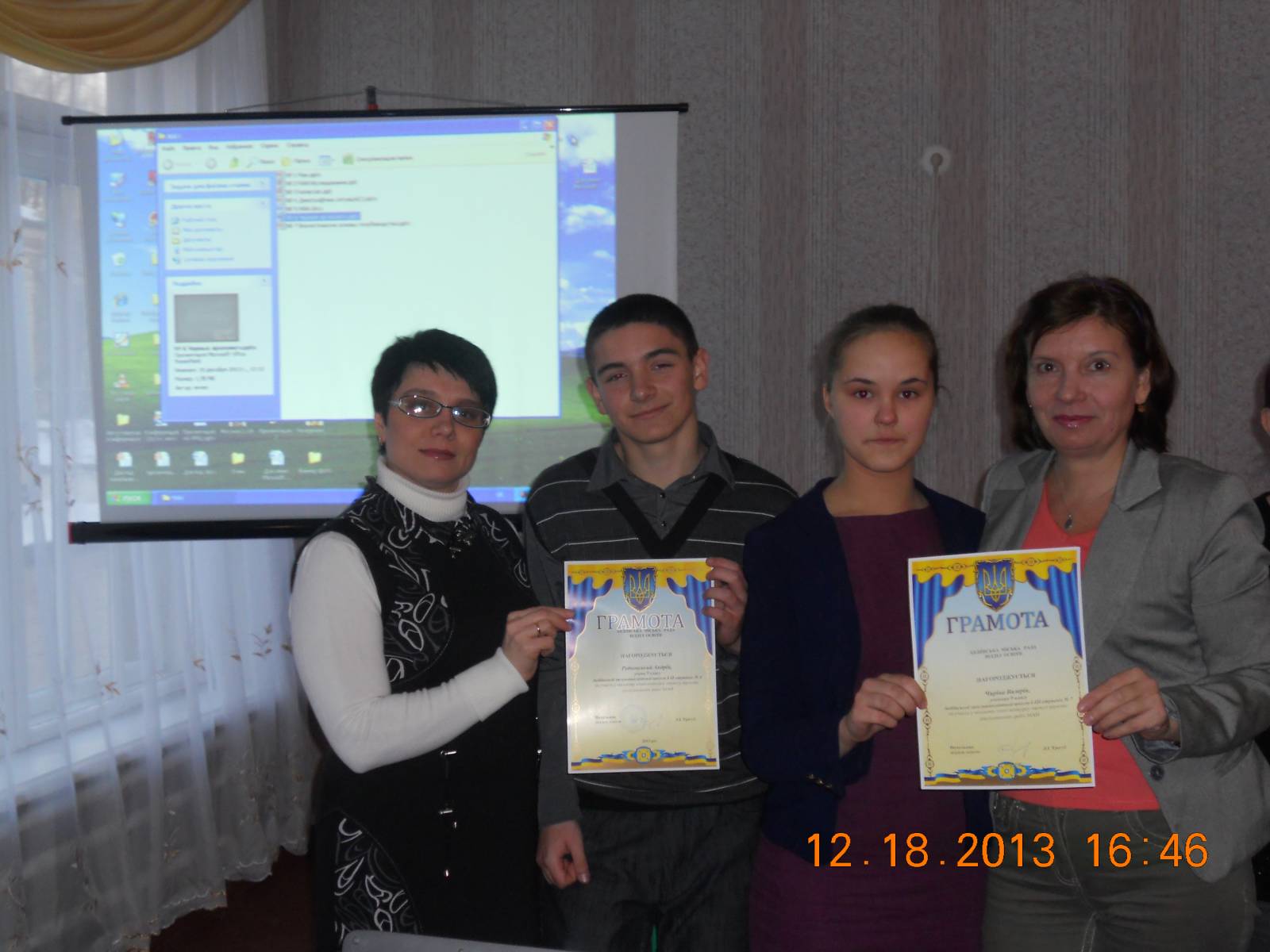 Прайс Ольга Николаевна и Рудковский Андрей, Лихацкая Наталья Алексеевна и Чирина Валерия с грамотами после защиты МАН